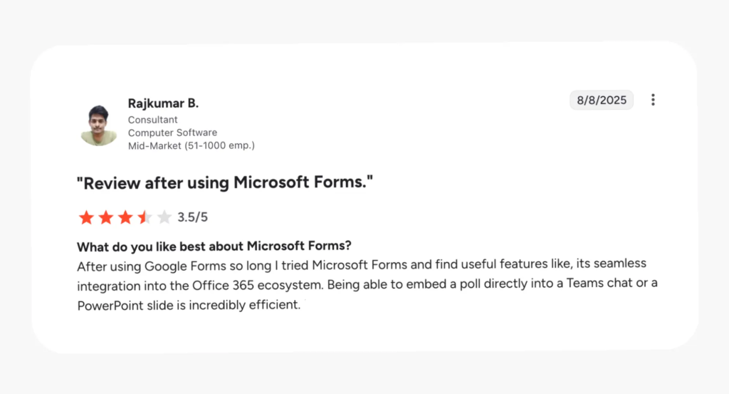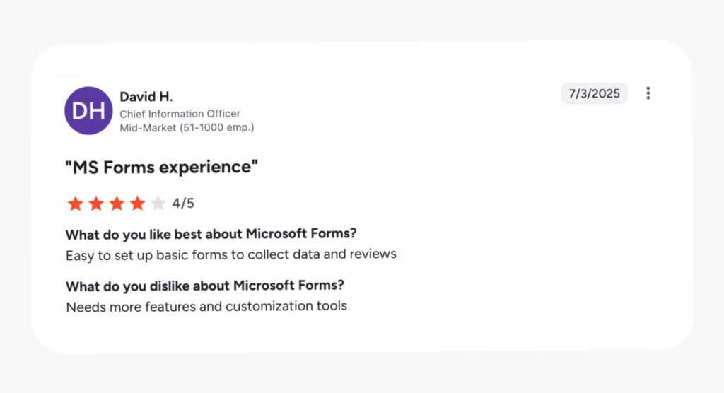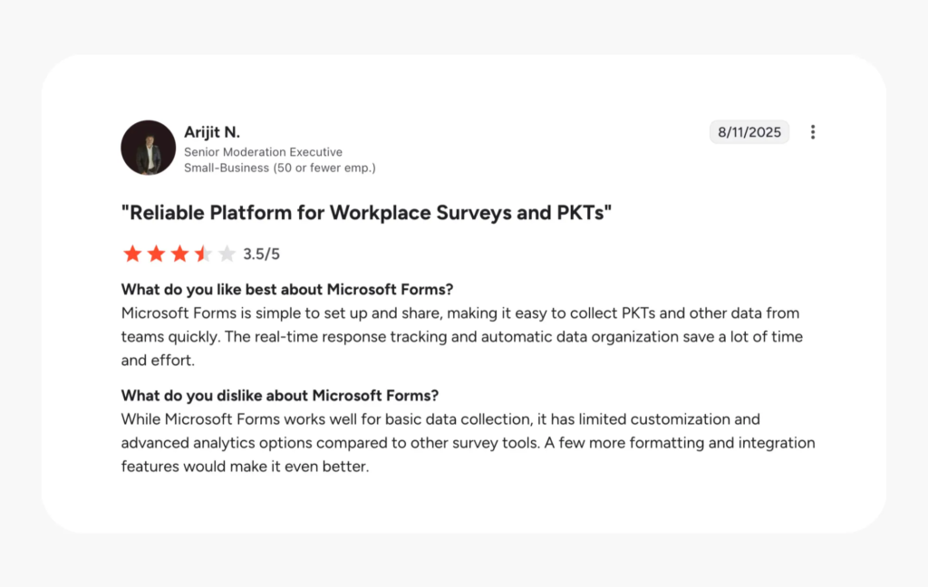 Microsoft Forms is a free web-based tool for creating surveys and polls. It’s built for getting feedback quickly, with easy sharing and real-time, visual summaries of results. As part of the Microsoft 365 ecosystem, it can integrate with other apps like Excel and Teams, as well as Power Automate and Copilot with additional licensing. Beyond business use, it’s also popular in schools.