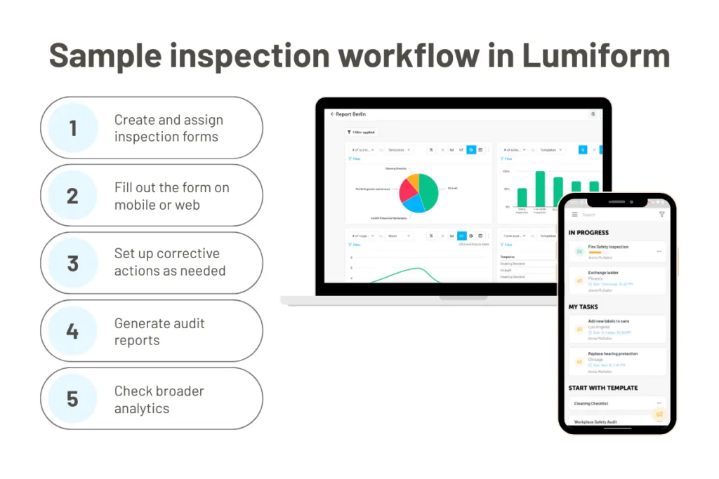 - Lumiform provides in-app dashboards and automatic inspection reports that work immediately, with thorough documentation.