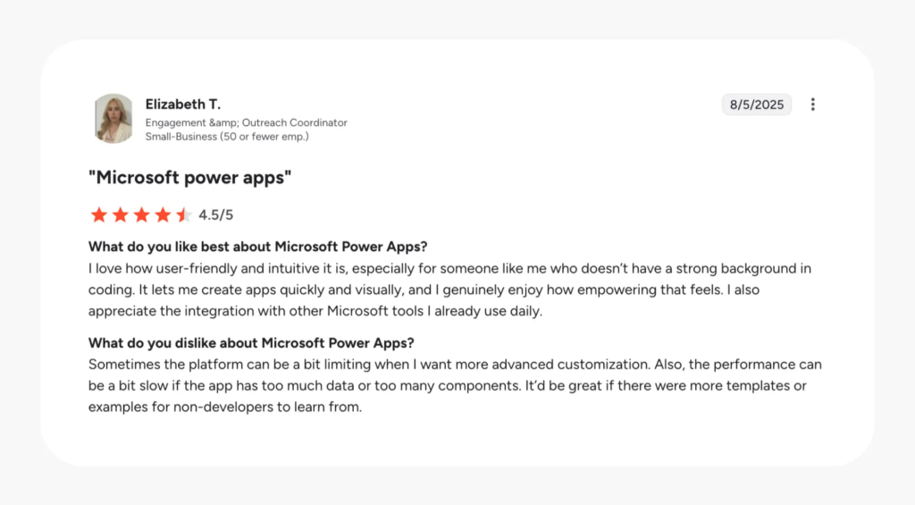 - Microsoft ecosystem support: Embed apps into Teams, use Azure services, and connect with Power BI.